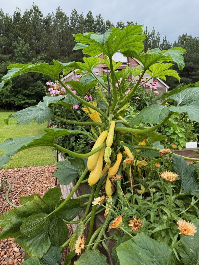 Training summer squash to grow vertically made harvesting easier and saved garden space. It also improved airflow and seemed to reduce pest problems.